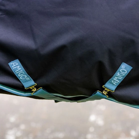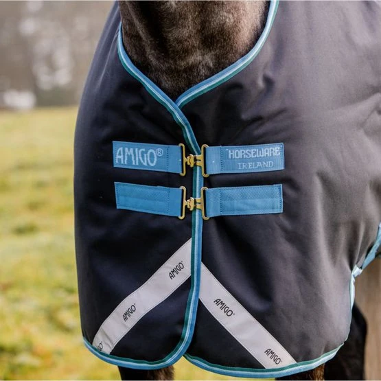 Die Amigo Bravo 12 Original Turnout ist eine 50-Gramm-Outdoor-Decke mit einem wasserdichten und atmungsaktiven 1200D-Polyester-Außenmaterial und einem glänzenden Polyester-Futter. Die Decke ist mit dem Horseware Liner System ausgestattet, mit dem Sie verschiedene Horseware Liner und Nackenstücke an der Decke befestigen können. Die Decke hat vordere Beinöffnungen für eine gute Passform und einen doppelten Haken-/Ösenverschluss auf der Brust. Außerdem hat die Decke Kreuzgurte unter dem Bauch, einen abnehmbaren Beingurt und einen Schweiflatz. Ein lockerer Hals ist mit dieser Decke erhältlich.