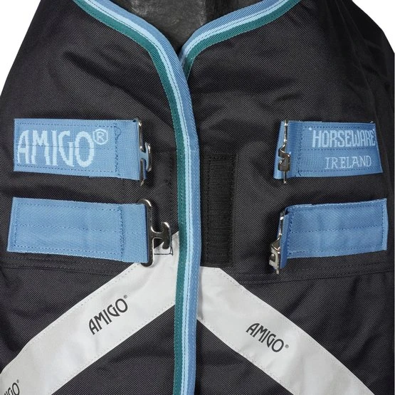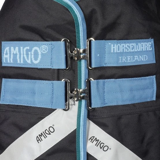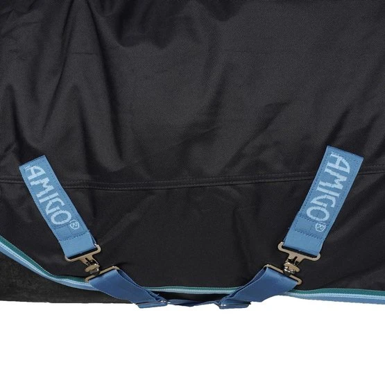 Die Amigo Bravo 12 Pony Plus Medium ist eine starke 250 g Outdoor-Decke mit einem wasserdichten und atmungsaktiven 1200D Polyester-Außenmaterial und einem glatten Polyester-Innenfutter. Diese Decke hat einen abnehmbaren Hals und ist mit dem Liner-System ausgestattet und hat daher Befestigungsringe für Horseware-Liner und Halsstücke. Die Decke hat einen doppelten Haken-/Ösenverschluss auf der Brust, Ausschnitte an den Beinen, reflektierende Streifen und zwei Kreuzgurte. Schließlich hat die Decke einen Beingurt und einen Schweiflatz.