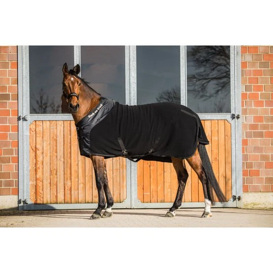 Das Back on Track Fleece Supreme, jetzt mit D-Ringen zur Befestigung eines Nackenteils, ist aus hochwertigem Fleece gefertigt und hat eine gute Passform. Die Decke kann als Schweiß-, Transport-, Unter- oder Stalldecke verwendet werden. Außerdem ist es ideal zum Aufwärmen der Muskulatur vor einem Training/Wettkampf und zur Unterstützung bei der Erholung nach einer Trainingseinheit. Die Nackenöffnung ist mit Polyester verstärkt und die Rückenlinie mit einem Rückengurt. Die Decke hat einen Teddy-Widerristschutz, doppelte Brustgurte, Kreuzbegurtung mit Schnellverschluss, einen großen Schweifschutz und einen Schweifriemen. Pferde schwitzen nicht übermäßig unter einer Back on Track-Decke. Erhältlich in schwarz.