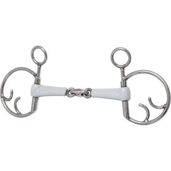 Unser neues einfach und doppelt gebrochenes Mundstück aus Kunststoff ist besonders schlank dimensioniert- breite Auflageflächen und eine geringe Höhe sorgen für mehr Komfort auch in kleineren Pferdemäulern. Die Oberfläche des Kunststoffes ist sehr glatt und gleitet auch bei wenig speichelnden Pferden gut im Maul. Das mit breiter Auflagefläche auf der Zunge und den Lefzen liegende Mundstück geht sanft modelliert in eine rotiert eingepasste Olive über. Die Gelenke und das Mittelstück sind fein gearbeitet und der geringen Höhe des Mundstücks angepasst montiert. Ruhiges Gleiten der Gebissringe wir durch eingearbeitete Kupferbuchsen garantiert.