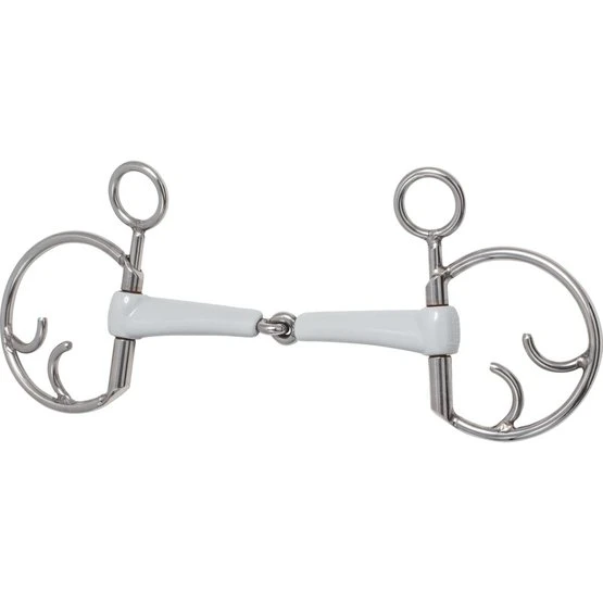 Unser neues einfach und doppelt gebrochenes Mundstück aus Kunststoff ist besonders schlank dimensioniert- breite Auflageflächen und eine geringe Höhe sorgen für mehr Komfort auch in kleineren Pferdemäulern. Die Oberfläche des Kunststoffes ist sehr glatt und gleitet auch bei wenig speichelnden Pferden gut im Maul. Das mit breiter Auflagefläche auf der Zunge und den Lefzen liegende Mundstück geht sanft modelliert in eine rotiert eingepasste Olive über. Die Gelenke und das Mittelstück sind fein gearbeitet und der geringen Höhe des Mundstücks angepasst montiert. Ruhiges Gleiten der Gebissringe wir durch eingearbeitete Kupferbuchsen garantiert.