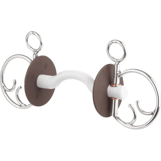 Die Zungenbogenstange verfügt über eine besondere, abgeplattete Form des Bogens. Die Zunge bekommt hierdurch ein optimales Platzangebot. Viele Pferde reagieren darauf mit verbesserter Losgelassenheit und vermehrter Kautätigkeit. Aber das Gebiss ist auch für sogenannte Zungenspieler, die versuchen ihre Zunge über das Gebiss zu stecken, sehr gut geeignet, da der Bogen dies wirkungsvoll verhindert.Dieses Mundstück eignet sich somit hervorragend für Pferde, die konventionell geformte Gebisse aufgrund des Drucks auf die Zunge ungern tolerieren und mit Kopfschlagen o.ä. reagieren. Die Springkombikandare ist eine effektive Vereinigung von einer Hebelwirkung auf die Unterkieferäste, einer Druckentfaltung auf das Genick und einer Lageveränderung des Gebisses im Pferdemaul. Drei unterschiedliche Einschnallmöglichkeiten erlauben einen wohldosierten Einsatz des Gebisses. Durch die massiven Seitenteile hat das Gebiss eine gewisse „Schwere“, die für eine ruhigere Lage im Maul sorgt.