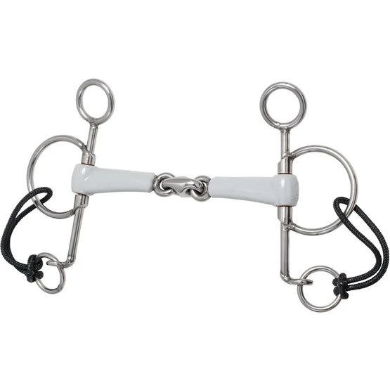 Unser neues einfach und doppelt gebrochenes Mundstück aus Kunststoff ist besonders schlank dimensioniert- breite Auflageflächen und eine geringe Höhe sorgen für mehr Komfort auch in kleineren Pferdemäulern. Die Oberfläche des Kunststoffes ist sehr glatt und gleitet auch bei wenig speichelnden Pferden gut im Maul. Das mit breiter Auflagefläche auf der Zunge und den Lefzen liegende Mundstück geht sanft modelliert in eine rotiert eingepasste Olive über. Die Gelenke und das Mittelstück sind fein gearbeitet und der geringen Höhe des Mundstücks angepasst montiert. Ruhiges Gleiten der Gebissringe wir durch eingearbeitete Kupferbuchsen garantiert.