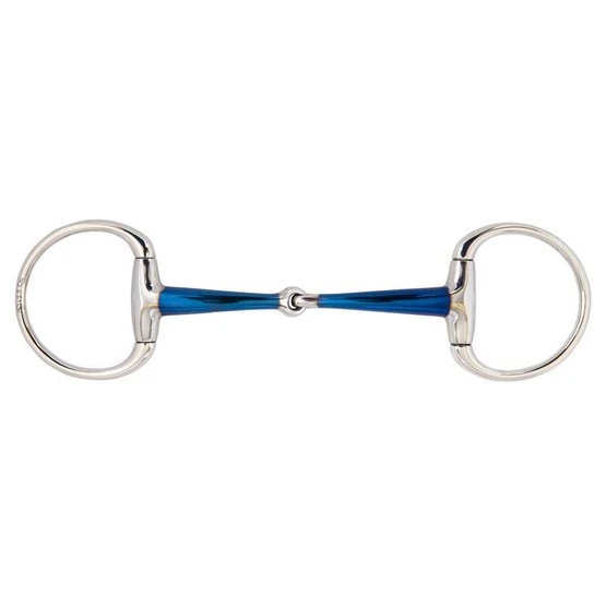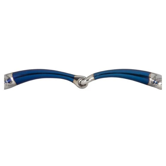 Diese einfach gebrochene Wassertrense enthält Ringe aus massivem Edelstahl und ein Mundstück aus Baustahl kombiniert mit einer Sweet-Iron-Schicht auf dem Mundstück (blau). Die Speichelproduktion wird noch zusätzlich gefördert durch die Sweet-Iron-Schicht auf dem Mundstück. Wenn dieses Material reagiert mit Feuchtigkeit, Wärme und Luft wird es oxidieren und einen süß schmeckenden Oberflächenrost entwickeln. Dies hilft bei der Akzeptanz des Gebisses. Letztendlich verschwindet die blaue Farbe, aber der Geschmack des Oberflächenrostes bleibt.