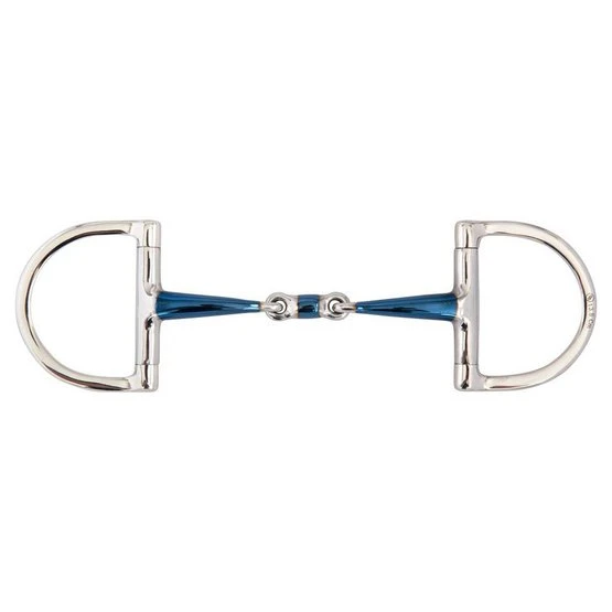 Diese doppelt gebrochene D-Ring-Trense enthält Ringe aus massivem Edelstahl und ein Mundstück aus Baustahl kombiniert mit einer Sweet-Iron-Schicht auf dem Mundstück (blau). Die Speichelproduktion wird noch zusätzlich gefördert durch die Sweet-Iron-Schicht auf dem Mundstück. Wenn dieses Material reagiert mit Feuchtigkeit, Wärme und Luft wird es oxidieren und einen süß schmeckenden Oberflächenrost entwickeln. Letztendlich verschwindet die blaue Farbe, aber der Geschmack des Oberflächenrostes bleibt. Das Mundstück ist 14 mm stark und die Gebissringe haben einen Durchmesser von 65 mm.