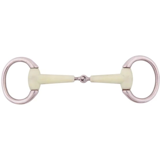 Doppelt gebrochene Olivenkopftrense für Pony mit Apple Mouth Mundstück und Edelstahlringen von 55 mm. Gebissdicke von 15 mm.