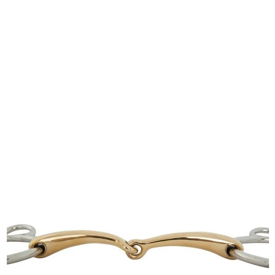 Diese qualitativ hochwertige, einfach gebrochene 3-Ring-Wassertrense ist aus massivem Cuprigan mit Edelstahlringen gefertigt. Cuprigan ist eine Legierung aus 89% Kupfer, 7% Aluminium, 3% Eisen und 1% Zink. Der Oxidationsprozess des Materials ergibt einen angenehmen Geruch und Geschmack. Die anatomische Form folgt der Form des Pferdemauls, was eine sanfte und gleichmäßige Druckverteilung ermöglicht. Die Kombination aus der Form und der einzigartigen Zusammensetzung von Cuprigan regt den Kauprozess und die Speichelbildung an, wodurch eine angenehme Verbindung mit dem empfindlichen Pferdemaul entstehen kann. Das Gebiss hat eine normale Wirkung auf das Maul und eignet sich für Pferde, die hart im Maul sind. Das Mundstück ist 12 mm stark und die mittleren Gebissringe haben einen Durchmesser von 70 mm.