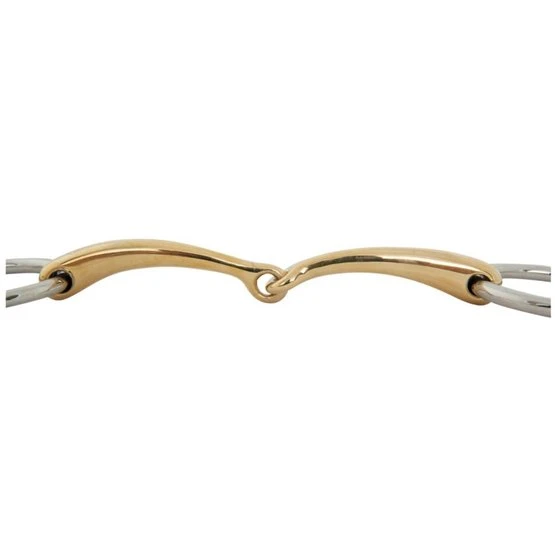 Diese qualitativ hochwertige, einfach gebrochene Unterlegtrense (Wassertrense) ist aus massivem Cuprigan mit Edelstahlringen gefertigt. Cuprigan ist eine Legierung aus 89% Kupfer, 7% Aluminium, 3% Eisen und 1% Zink. Der Oxidationsprozess des Materials ergibt einen angenehmen Geruch und Geschmack. Die anatomische Form folgt der Form des Pferdemauls, was eine sanfte und gleichmäßige Druckverteilung ermöglicht. Die Kombination aus der Form und der einzigartigen Zusammensetzung von Cuprigan regt den Kauprozess und die Speichelbildung an, wodurch eine angenehme Verbindung mit dem empfindlichen Pferdemaul entstehen kann. Das Gebiss hat eine normale Wirkung auf das Maul. Das Mundstück ist 12 mm stark und die Gebissringe haben einen Durchmesser von 50 mm.