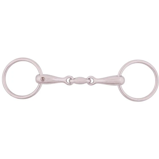 Doppelt gebrochen, massiv, Edelstahl. Durchmesser des Gebißrings bei 11.5 cm ist 55 mm, bei den anderen Größen 65 mm. Gebissdicke von 16 mm.