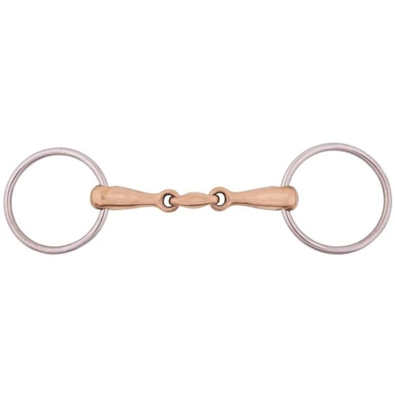Doppelt gebrochen, Cuprion massiv mit Edelstahlringen, Ringe 65 mm. Gebissdicke von 18 mm.
