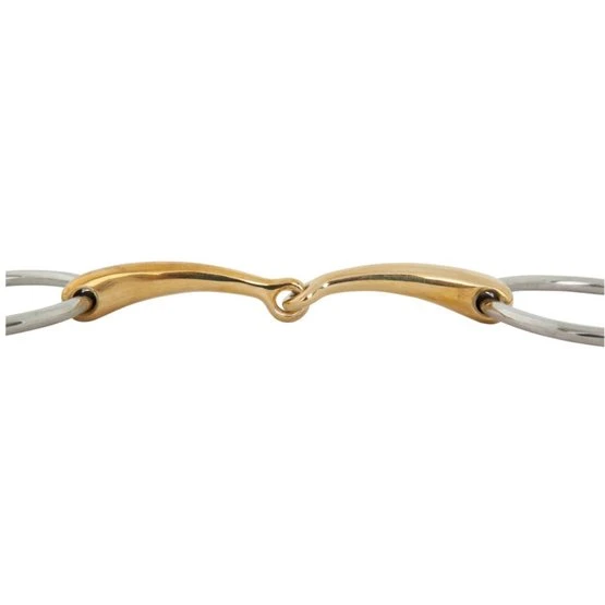Diese qualitativ hochwertige, einfach gebrochene Wassertrense ist aus massivem Cuprigan mit Edelstahlringen gefertigt. Cuprigan ist eine Legierung aus 89% Kupfer, 7% Aluminium, 3% Eisen und 1% Zink. Der Oxidationsprozess des Materials ergibt einen angenehmen Geruch und Geschmack. Die anatomische Form folgt der Form des Pferdemauls, was eine sanfte und gleichmäßige Druckverteilung ermöglicht. Die Kombination aus der Form und der einzigartigen Zusammensetzung von Cuprigan regt den Kauprozess und die Speichelbildung an, wodurch eine angenehme Verbindung mit dem empfindlichen Pferdemaul entstehen kann. Das Gebiss hat eine weiche Wirkung auf das Maul. Das Mundstück ist 16 mm stark und die Gebissringe haben einen Durchmesser von 70 mm.