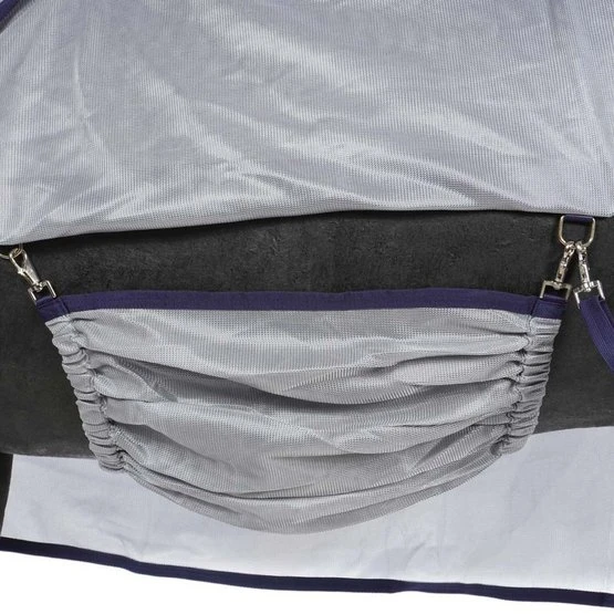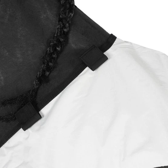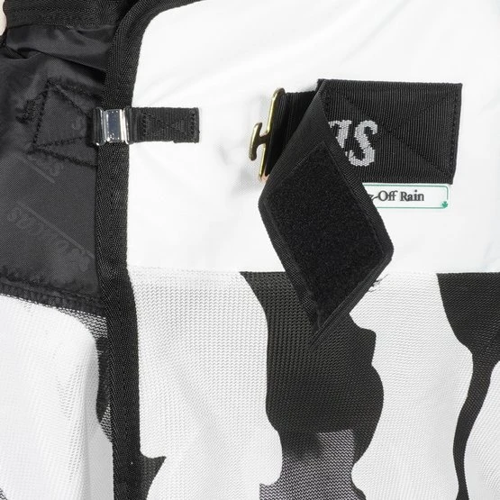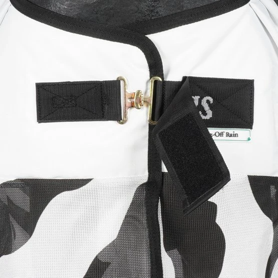 Die Buzz-Off Rain ist eine kombinierte Regen-/Fliegendecke. Eine perfekte Decke, wenn sich heiße und nasse Tage abwechseln. Die Eigenschaften der Buzz-Off Fly Blankets und Sun Shower Blankets wurden kombiniert, um den Buzz-Off Rain zu kreieren. Der obere Teil des Buzz-Off Rain ist wasserdicht und atmungsaktiv, während der untere Teil aus dem gleichen Material wie das Buzz-Off-Fliegenblatt besteht. Dadurch entsteht eine leichte, wasserdichte Decke mit UV-Schutz. Der Schweiflatz gibt dem Schweif zusätzlichen Schutz. Die Schulterfalten bieten zusätzlichen Platz für die Schultern und die glatte Polsterung an den Schultern verhindert Scheuern. Die Decke hat einen T-Haken-Brustverschluss mit Klettverschluss und ist mit einer elastischen und abnehmbaren Bauchlasche versehen, die dafür sorgt, dass die Decke an Ort und Stelle bleibt und der Bauch optimal vor Insekten und Fliegen geschützt ist. Die Decke hat einen Beingurt und einen Schweiflatz, es gibt Befestigungspunkte für Gurte (nicht im Lieferumfang enthalten).