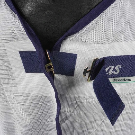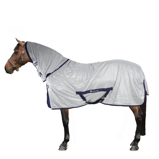 Die Bucas Freedom Fly Sheet ist eine Fliegendecke mit festem Hals. Diese Decke besteht aus feinmaschigem Material (Polyester), um Ihr Pferd vor den Fliegen zu schützen. Die Decke hat einen Brustverschluss auf der Brust mit Klettverschlüssen, Kreuzgurte, um sicherzustellen, dass die Decke an ihrem Platz bleibt, Gesäßbefestigungspunkte (nicht enthalten) und eine Schnur. Außerdem hat diese Decke eine große Heckklappe, die den Schwanz schützt. (Die Maske ist nicht in der Decke enthalten).