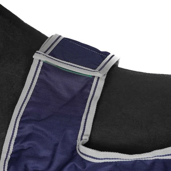 Die Decke besteht aus einem wasserdichten und atmungsaktiven Ripstop-Außenmaterial und hat ein glattes Nylonfutter. Der reflektierende Stoff auf der Rückseite der Decke sorgt dafür, dass das Pferd im Dunkeln gut sichtbar ist.