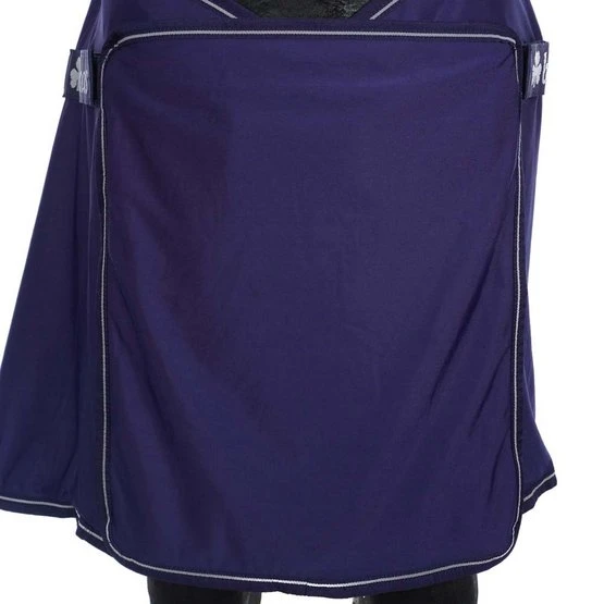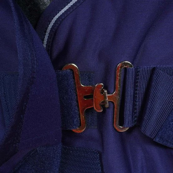 Diese lässt sich einfach mit zwei Klettverschlüssen befestigen. Die Decke kann auch ohne das abnehmbare Vorderteil verwendet werden. Die mit einem Seidenfutter überzogenen Schulterfalten geben dem Pferd viel Schulterfreiheit. Der T-Haken-Frontverschluss und die Beingurte halten die Decke an Ort und Stelle. Diese Decke hat keine Bauchgurte.