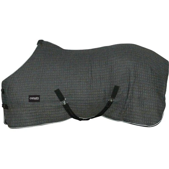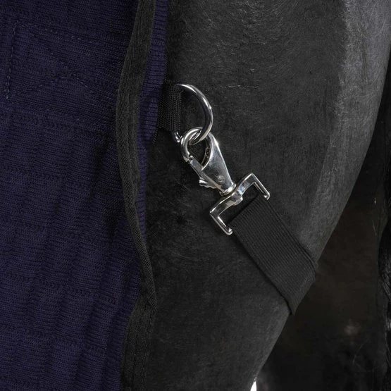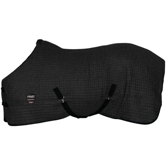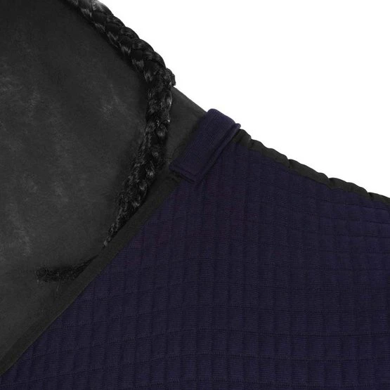 Bequemer und funktioneller Kühlteppich aus 100% Acryl mit Wolleffekt. Ideal als Transportteppich oder nach dem Training, da das Material überschüssige Wärme und Schweiß vom Pferd wegtransportiert. Der Teppich hat eine schwarze Bindung, einen doppelten Frontverschluss, abnehmbare Kreuzgurte und elastische Beinriemen.