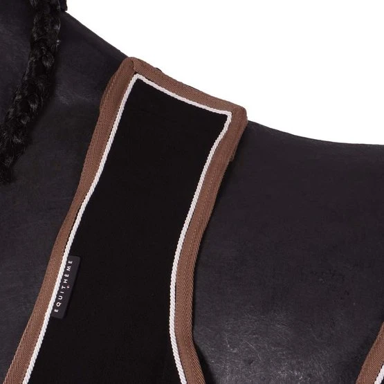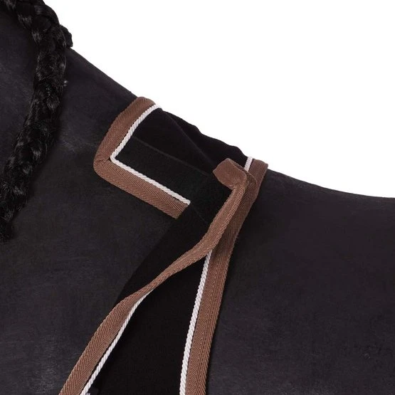 Saugfähig und schnelltrocknend aus 100% fusselfreiem Polyester mit einer Nennleistung von 280 g / m². Rand verziert mit kontrastierenden Paspeln und Geflecht. Mit Sattelausschnitt, selbstgreifender Befestigung am Widerrist und Schweifriemen. Zur Förderung des Kontakts mit dem Unterschenkel und zur Vermeidung von Abrieb.