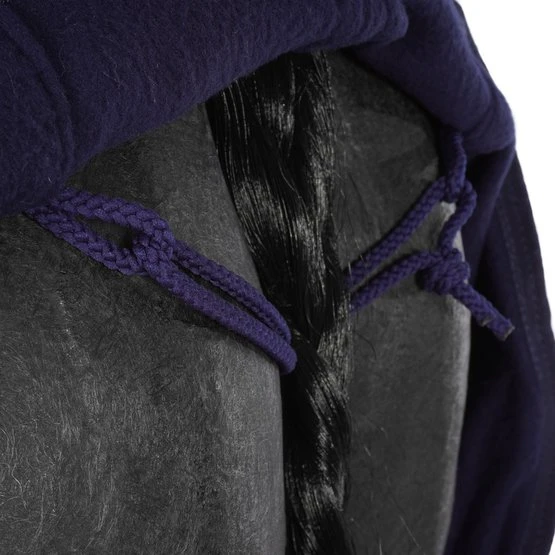 Synthetisches Schaffellvlies mit hoher Dichte an der Rückseite der Sattelmulde, um Scheuern zu vermeiden. Schließt mit Klettverschluss am Widerrist und Schweifriemen. Ausschnitt vorne zur Förderung des Kontakts mit dem Unterschenkel. Zusammensetzung: 100 % Polyester.
