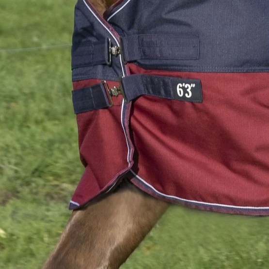 Wasserdichter und atmungsaktiver Outdoor-Teppich mit halbem Hals aus Ripstop-Polyester mit 1200 Denier, Klebebandnähten und Nylonfutter. Verfügt über eine sehr große wasserdichte Heckklappe, die mit einem reflektierenden Band, niedrigen Kreuzstreifen und Beinriemen verziert ist. Schneller Verschluss auf der Brust, verstärkt mit Klettbändern, mit Größenangabe auf Gummipatch.