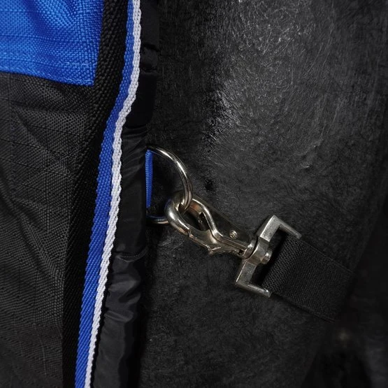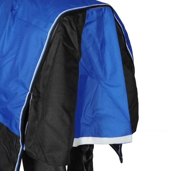 Wasserdichte, atmungsaktive 1200-Denier-Ripstop-3000/3000-Polyester-Kombinations-Outdoor-Decke mit verklebten Nähten und Nylonfutter. Kommt mit einem sehr großen wasserdichten Schweiflatz, der mit einem reflektierenden Band verziert ist, bequemen Zwickeln, niedrigen Kreuzgurten und Beinriemen. Brustverschluss mit Schnellverschluss, verstärkt mit Klettverschlüssen, mit Größenangabe auf Gummipatch.