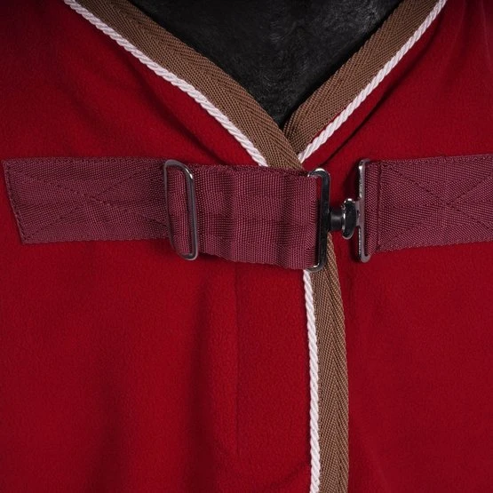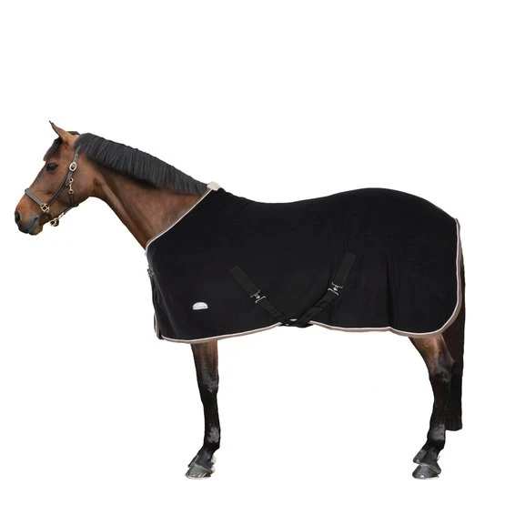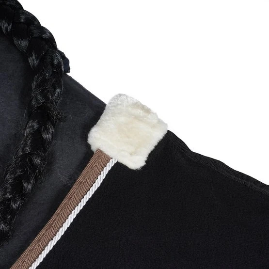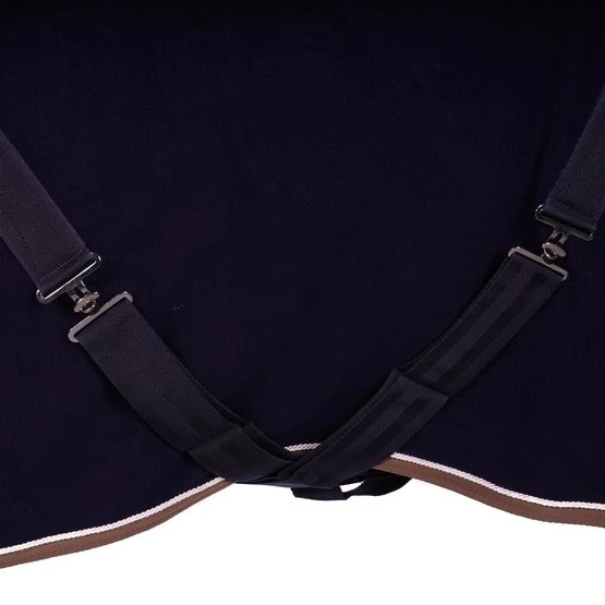 Praktisch und vielseitig, als Trockner, Unterlage oder zum Transport geeignet, aus 100% Polyester-Flusenschutzvlies mit einer Nennleistung von 280 g / m². Rand verziert mit kontrastierenden Paspeln und Geflecht. Ausgestattet mit einem Low-Cross-Gurtband mit vollständig abnehmbaren Schnallen und Gummistopfen, einer Widerristhaut aus synthetischem Lammfell und einem Schweifriemen. Verstellbarer Brustverschluss mit Metallschnalle.