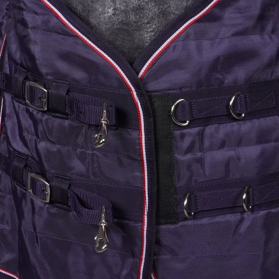 Außen sehr robustes 840 D Polypropylen. Die 50 Polyfill-Polsterung und das Polycotton-Futter sorgen für Wärme und Feuchtigkeitstransport. Niedrige Kreuzgurte und Zwickel. Verstellbare elastische Beingurte und durch Druckknopf abnehmbar. Schnellverschluss an Brust- und Schweifriemen