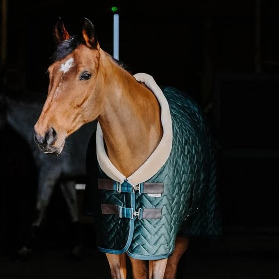 Decke eine Faserfüllung von 150 g/mÇ und eignet sich perfekt für den Einsatz im Stall. Ein extrem dichter, synthetischer Lammfell-Kragen, 2 Frontverschlüsse sowie Kreuzgurte runden dieses Produkt ab. Um mehr Komfort für das Pferd