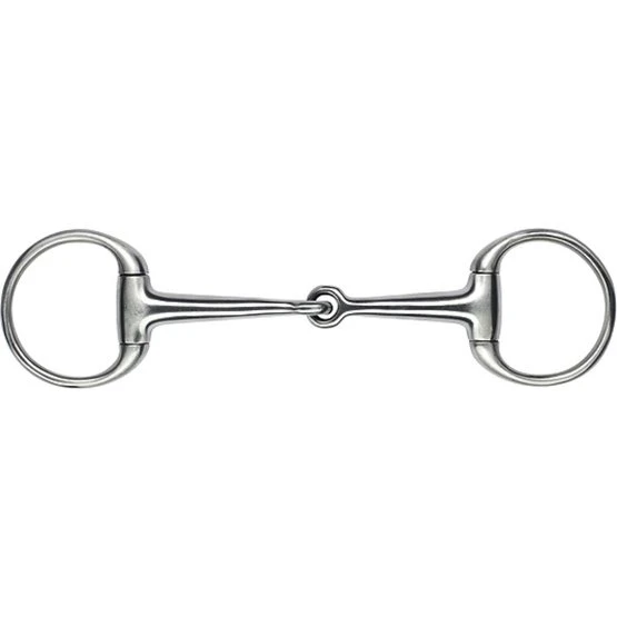 Aus satiniertem Edelstahl. Kleine Ringe und dünnes Mundstück. Dicke des Mundstücks: 14 mm, Durchmesser der Ringe: 55 mm, Mundstück: massiv