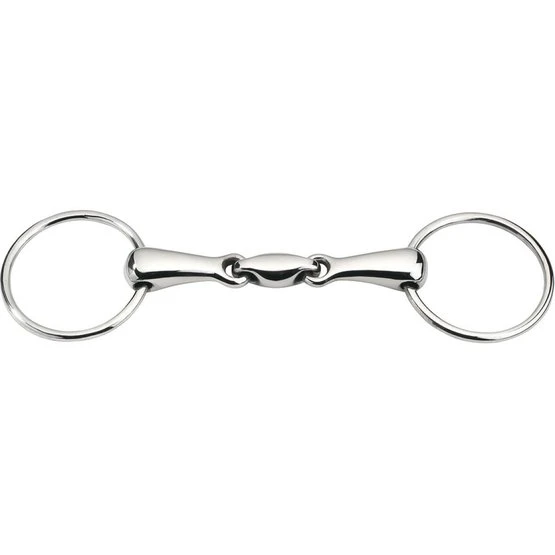 Aus Edelstahl mit anatomisch geformtem, doppelt gebrochenem Mundstück. Dickes Mundstück. Durchmesser der Ringe: 65 mm, Mundstück: hohl