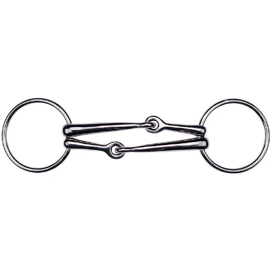 Doppeltrense aus Edelstahl. Für Pferde mit hartem Maul, die aber nicht pullen, empfohlen. Der asymmetrische Bruch wirkt entspannend.