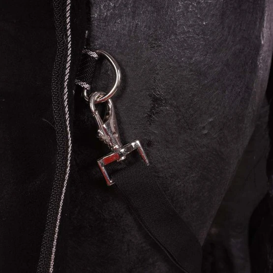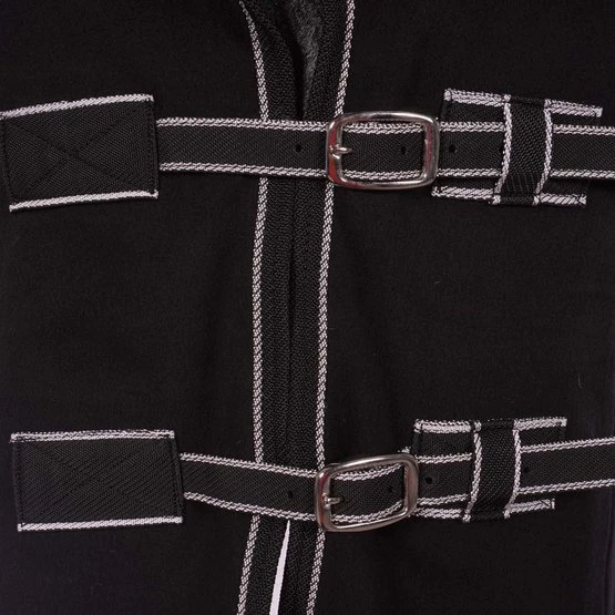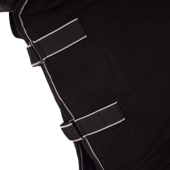 Fleecedecke mit einem festen Halsteil, mit elastischen und abnehmbaren Gurtbändern. Die Decke besitzt einen Schweifriemen und einen doppelten Brustverschluss und besteht aus 100% Polyester-Microfleece.