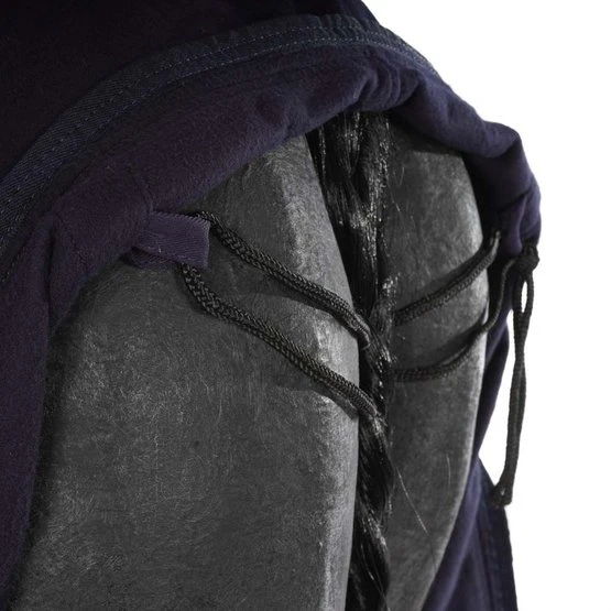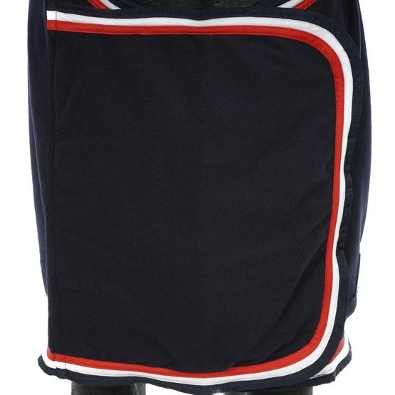 Pferdedecke aus hochwertigem Fleece, ein mit Brustklappe überdeckter Vorderverschluss, abnehmbare Hinterhandgurte an einer Seite mit Klettverschluss, Schweifriemen. Doppelte Paspel entlang der Befestigung, die damit optisch wie eine rot/weiß/blaue Flagge wirkt. Material: 100 % Polyester