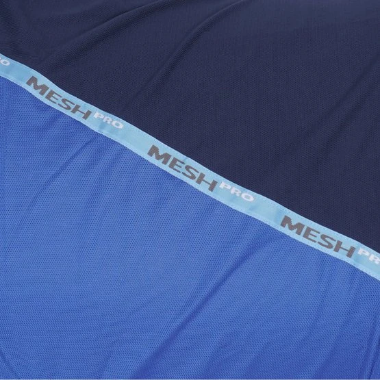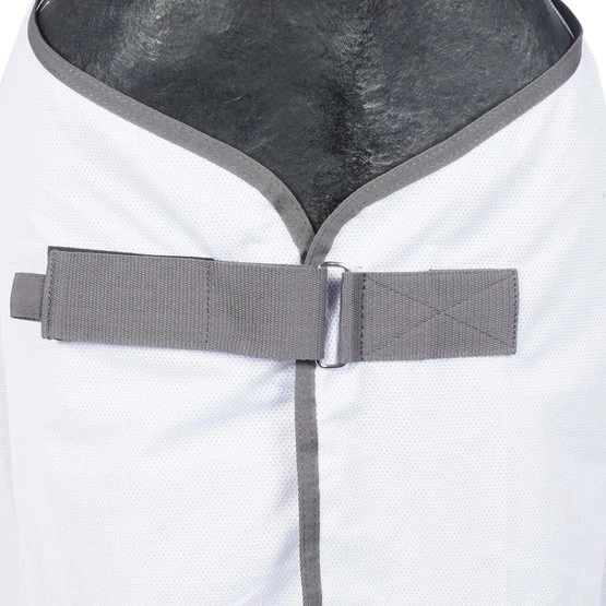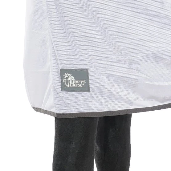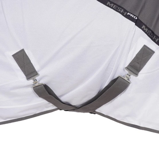Zweifarbige Mesh-Decke zur Verwendung als Fliegen- oder Kühldecke, einfacher Klettverschluss vorne, zwei Kreuzgurte, Schweiflatz, vorderseitig mit Nylon gefüttert, um kahle Stellen zu vermeiden.