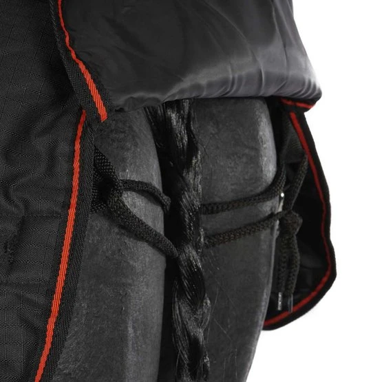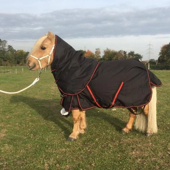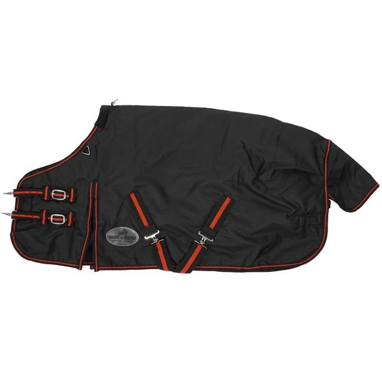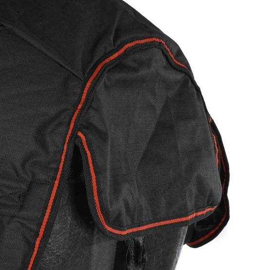 Aus 600D Nylon und 300 Gramm gefüttert. Diese Decke ist wasserdicht und verfügt über einen abnehmbaren Hals, Zwickel, doppelte Schnellverschlussschnalle vorne mit Klettverschluss auf der Brust, Nylonfutter gegen Abrieb, Kreuzbegurtung, elastische Beinriemen und Schweifklappe.