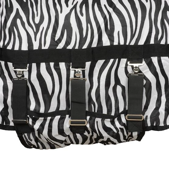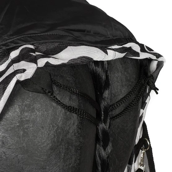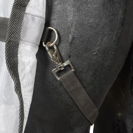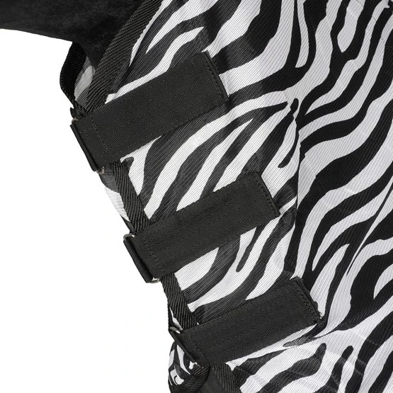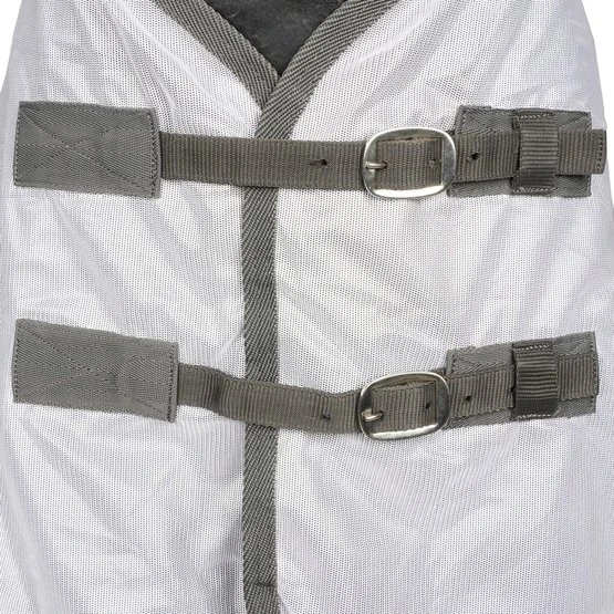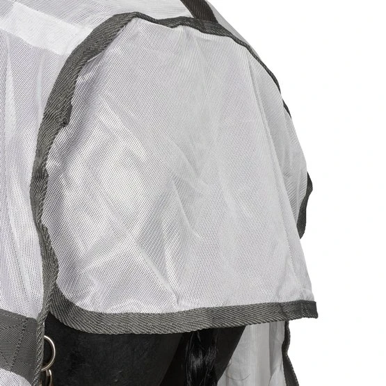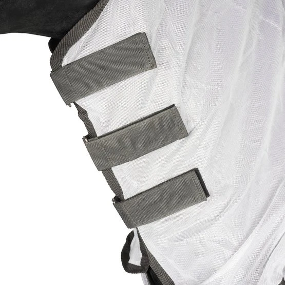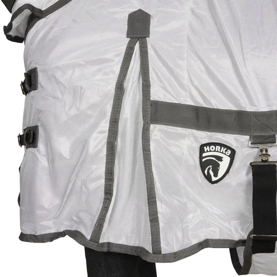 Die Horka Anti-Fliegen Decke mit abnehmbarem Halsteil besteht aus einem feinen Meschgewebe (100% Polyester). Der Brust- und der Schweiflatz sind aus Nylon, gegen das Scheuern der Decke. Die Fliegendecke hat ein extra langes Halsteil, welches den Hals gut bedeckt, auch während des Grasens. Erhältlich ist die Fliegendecke in grau / rot und mit Zebradruck. Eine abnehmbare Fliegenmaske ist getrennt von der Decke erhältlich.