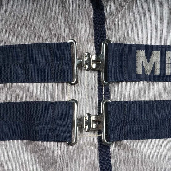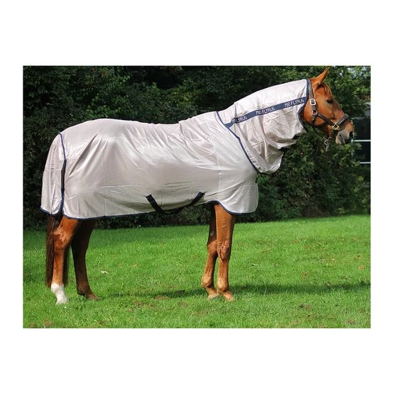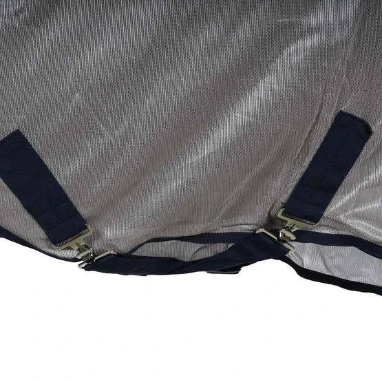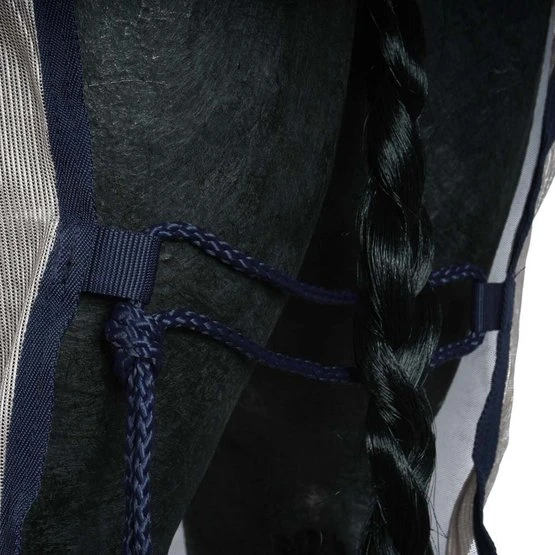 Fliegendecke mit festem Halsteil, Ausschnitt an den Vorderbeinen, klassischer Brustverschluß, Kreuzbegurtung, Schweifriemen und langer Schweifschutz. Diese Decke schützt ihr Pferd optimal vor Fliegen und anderen lästigen Insekten.