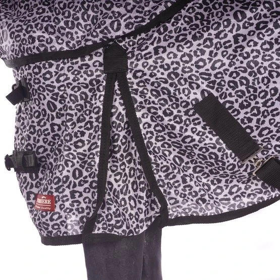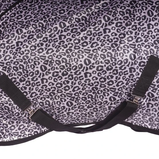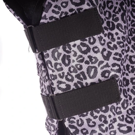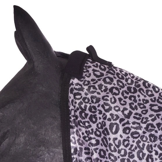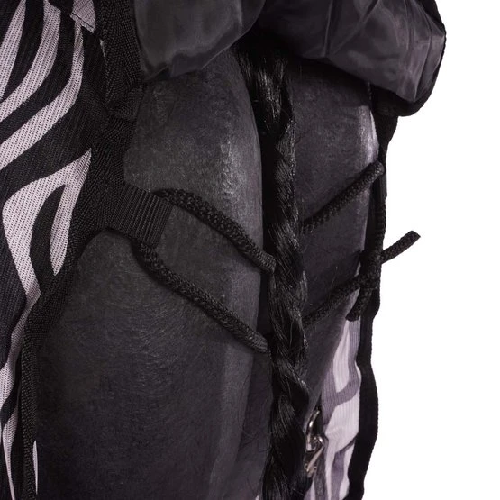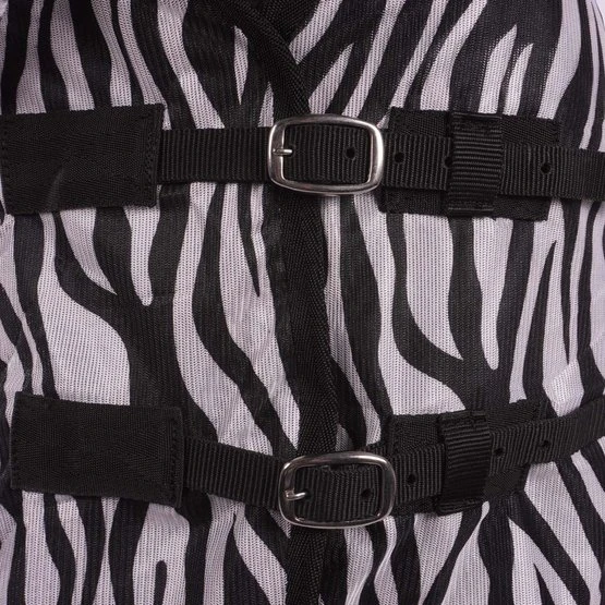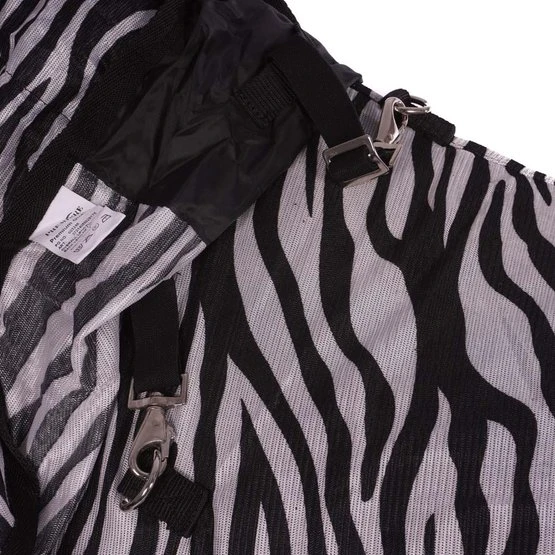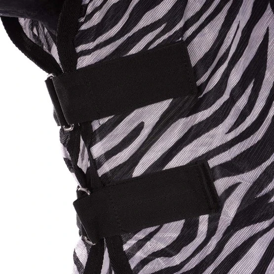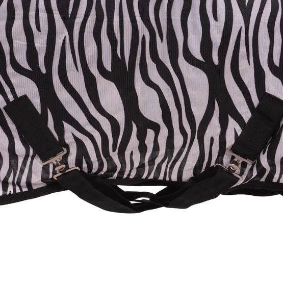 Fliegendecke mit abnehmbarem Halsteil in Zebra-Motiv. Wissenschaftliche Forschung zeigt, dass ein Zebra-Motiv weniger Fliegen anzieht. Die Fliegendecke ist ausgestattet mit einem einfachen, verstellbaren Verschlusssystem, Gehfalten, verstellbaren Kreuzgurten, elastischen Beinschnüren, einem Schweifriemen und einem Schweiflatz. Das abnehmbare Halsteil hat zwei Klettverschlüsse. Das Halsteil hat außerdem ein Genickpolster aus Fleece für zusätzlichen Schutz hinter den Ohren des Pferdes. Das Halsteil hat einen Klettverschluss mit Elastik an der Oberseite zur Befestigung von dem Halfter und drei Wirbelkarabiner mit Elastik um das Halsteil an der Decke zu befestigen. Material: 100% Polyester Mesh mit einem Futter aus 190T Taffeta Nylon.