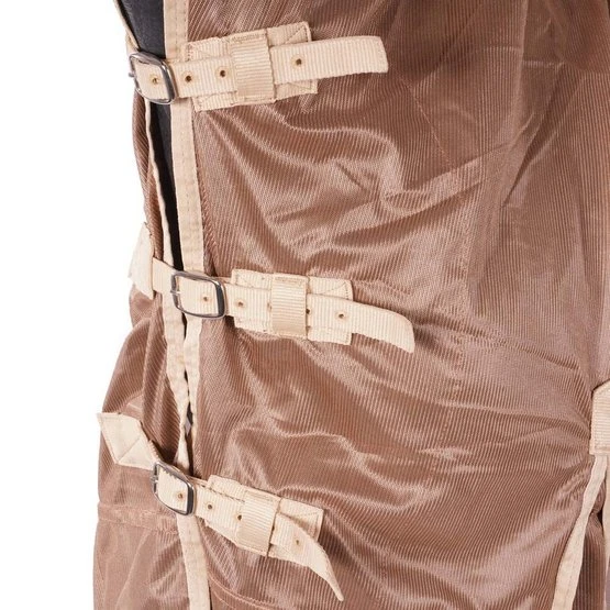 • Das feste Halsteil hat einen Befestigungsriemen mit Klett an der Oberseite zur Befestigung einer Fliegenmaske