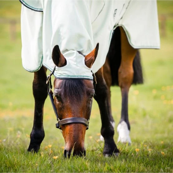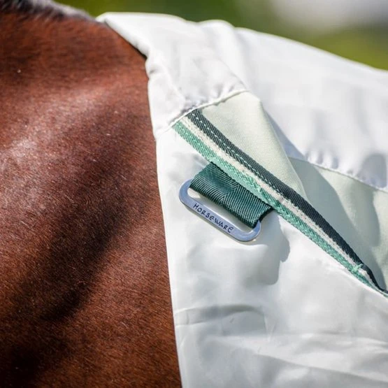 Der Rambo Hoody ist eine Fliegen-/Ekzemdecke aus starkem, strapazierfähigem, atmungsaktivem 1000D-Polyester, um die kleinsten Fliegen/Mücken abzuwehren. Außerdem ist die Decke UV-beständig. Diese Decke kommt komplett mit einem fixierten Ausschnitt und Ohrenausschnitten und kann Ponys mit Neurodermitis helfen. Die Decke verfügt über einen V-Front-Verschluss auf der Brust, Klettverschlüsse am Hals, drei Gurte unter dem Bauch, einen Beingurt und einen extra langen Schweif und Seiten. Mit dem separat erhältlichen Horseware Fly Rug Liner kann die Decke auf der Rückseite wasserdicht gemacht werden.