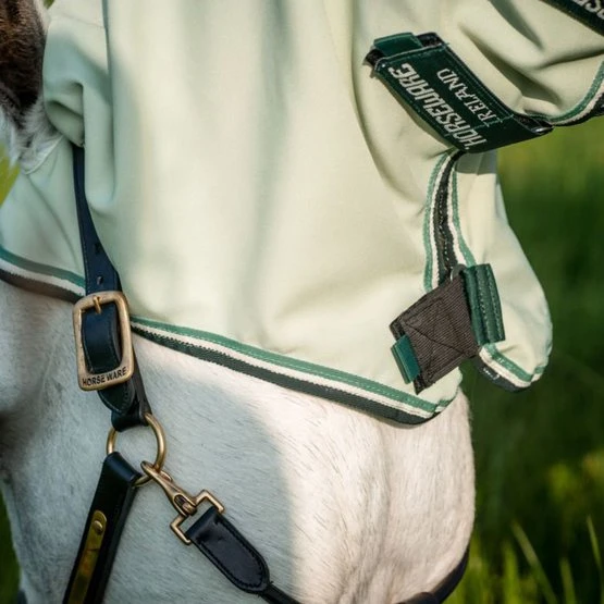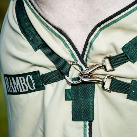 Der Rambo Hoody XL ist eine Fliegen-/Ekzemdecke aus starkem, strapazierfähigem, atmungsaktivem 1000D-Polyester, um die kleinsten Fliegen/Mücken abzuwehren. Außerdem ist die Decke UV-beständig. Diese Decke wird komplett mit festen Hals- und Ohrenausschnitten geliefert. Die Decke verfügt über einen V-Front-Verschluss auf der Brust, Klettverschlüsse am Hals, drei Gurte unter dem Bauch, einen Beingurt und einen extra langen Schweif und Seiten. Mit dem separat erhältlichen Horseware Fly Rug Liner kann die Decke auf der Rückseite wasserdicht gemacht werden.