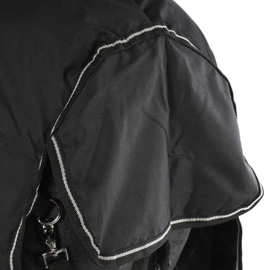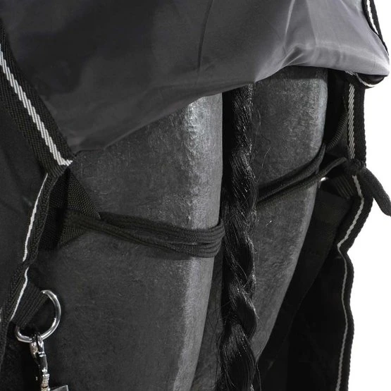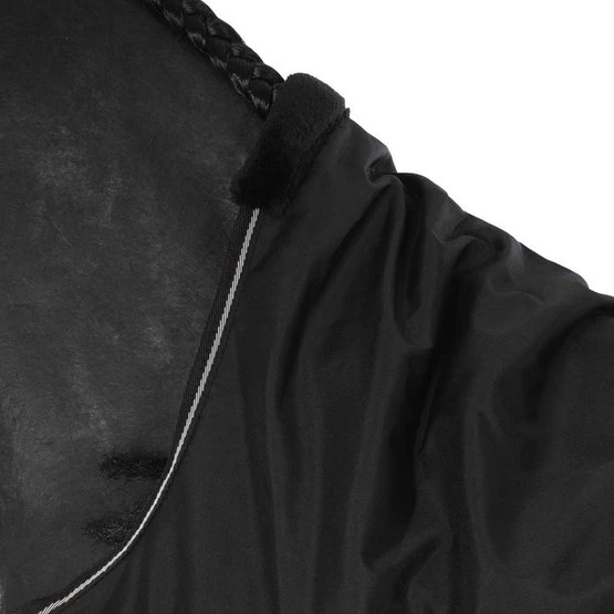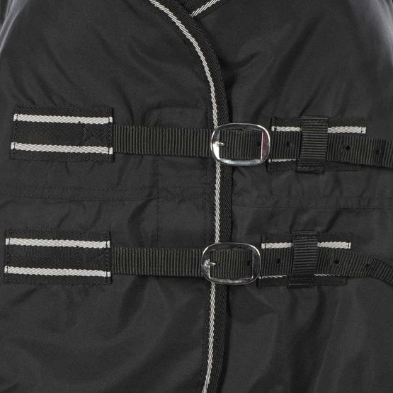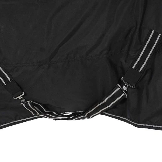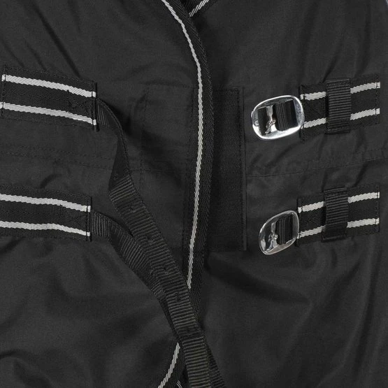 Wasserdichte Decke aus 300D Matty Polyester mit Polycotton-Futter. Mit Zwickeln, Widerrist aus synthetischem Schaffell, elastischen, niedrigen Kreuzstreifen, abnehmbaren und verstellbaren Beinriemen mit Karabinerhaken, Heckriemen und wasserdichter Heckklappe. Der verstellbare Brustverschluss mit Schnallen und Riemen ist mit Klettverschluss verstärkt. Metallschnallen.