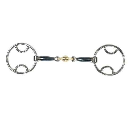 Das abgeschrägte Bit ermöglicht eine leichte Hebelwirkung und bietet etwas mehr Kontrolle, wodurch Kontur, Kopfbewegung und Reaktionsfähigkeit gefördert werden. Die losen Scheiben aus Messinglegierung in der Mitte können helfen, ein pingeliges Zungenpferd zu beruhigen. Mundstückstärke: 15mm. Wangenhöhe: 55 mm (4,5 „, 5“), 70 mm (5,5 „).