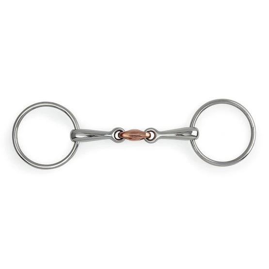 Die losen Ringe halten das Pferd davon ab, das Gebiss zu greifen. Das Kupferstück sorgt dafür, dass das Pferd das Stück früher nimmt.