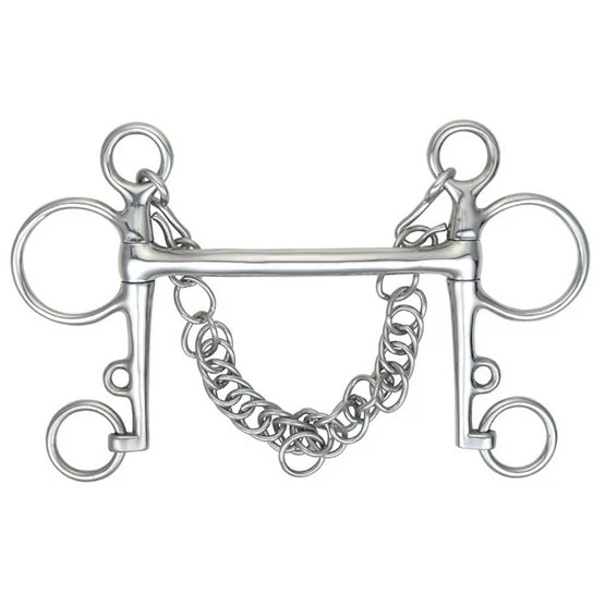 Dies ist ein sehr mildes Gebiss, da der Druck gleichmäßig durch den Mund verteilt wird. Ideal für Pferde mit kleinen oder weichen Mündern. Kann mit Doppelzügel oder Pelham-Rundungen verwendet werden.