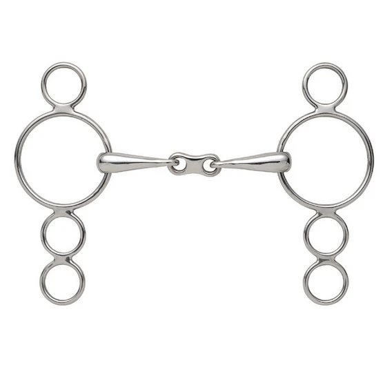 Das Glied bedeutet, dass Druck auf beide Seiten der Zunge ausgeübt wird. Einige Pferde mit niedrigem Gaumen finden dies etwas bequemer, da das Mundstück nicht mit dem Gaumen in Kontakt kommen sollte. Die drei Ringe bieten die Möglichkeit zur Hebelwirkung.