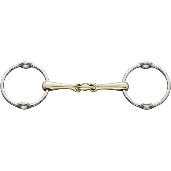 Doppelt gebrochene Wassertrense aus der Kollektion KK Ultra. 16 mm dick. 12,5 cm breit. Material Sensogan mit Edelstahlringen. Regt die Speichelproduktion, die Kautätigkeit und damit die Gebissannahme an. Das Mittelteil ist um 45 Grad geneigt, damit das Gebiss optimal auf der Zunge liegt. Bei einer Rückholaktion kann durch die Verwendung eines Backenstücks mehr Druck hinter den Ohren ausgeübt werden. Mehr Kontrolle über Pferde mit starkem Vorwärtsdrang.