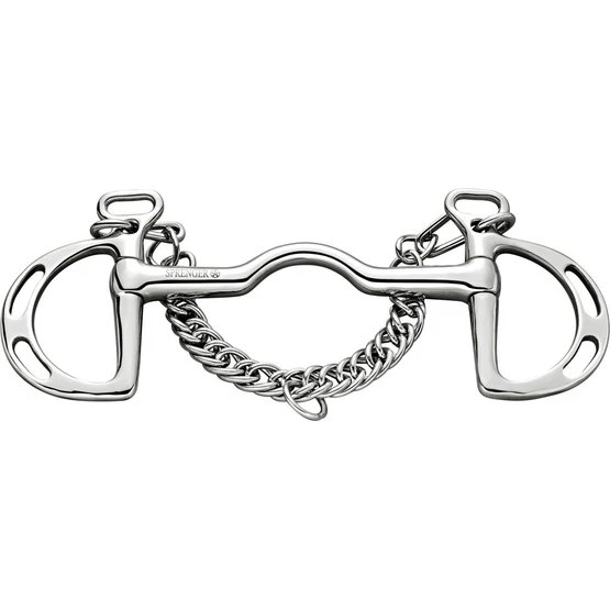 Ungebrochenes Kimblewick-Gebiss mit Zungenbogen. 16 mm dick. 11,5 cm breit. Material: Edelstahl. Auch bekannt als Thiedeman-Gebiss. Durch die verschiedenen Befestigungsmöglichkeiten der Zügel kann die Druckverteilung auf der Zunge, hinter den Ohren und am Unterkiefer selbst bestimmt werden. Hat eine etwas leichtere Hebelwirkung als ein Pelham-Gebiss.