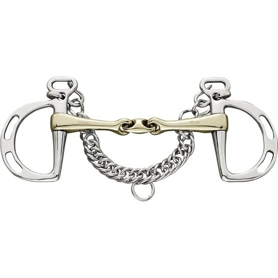 Doppelt gebrochene Trense KK Ultra Kimblewick. 16 mm dick. 12,5 cm breit. Material Sensogan mit Seitenteilen aus Edelstahl. Auch bekannt als Thiedeman-Gebiss. Regt die Speichelproduktion, die Kautätigkeit und damit die Gebissannahme an. Das Mittelteil ist um 45 Grad geneigt, damit das Gebiss optimal auf der Zunge liegt. Durch die unterschiedlichen Befestigungsmöglichkeiten der Zügel kann die Druckverteilung auf der Zunge, hinter den Ohren und am Unterkiefer selbst bestimmt werden. Hat eine etwas leichtere Hebelwirkung als ein Pelham-Gebiss.