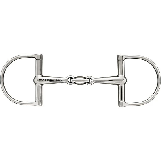 Doppelt gebrochene MAX Control D-Trense. 16 mm dick. 12,5 cm breit. Material: Edelstahl. Das Aussehen eines MAX-Steuergebisses ist fast identisch mit einem normalen Doppelgelenkgebiss. Bei den MAX-Steuerbits blockiert das Mundstück jedoch ab einem bestimmten Druck und verwandelt sich in eine ungebrochene Stange. Wenn dieser Druck nachlässt, weil sich die Hand des Reiters entspannen kann, kehrt die Funktion eines normalen doppelt gebrochenen Gebisses zurück. Dies gibt Ihnen mehr Kontrolle, wenn ein Pferd sehr stark wird. Die festen Seitenteile sorgen für zusätzlichen Seitenhalt und eine direkte Wirkung der Zügelhilfen.