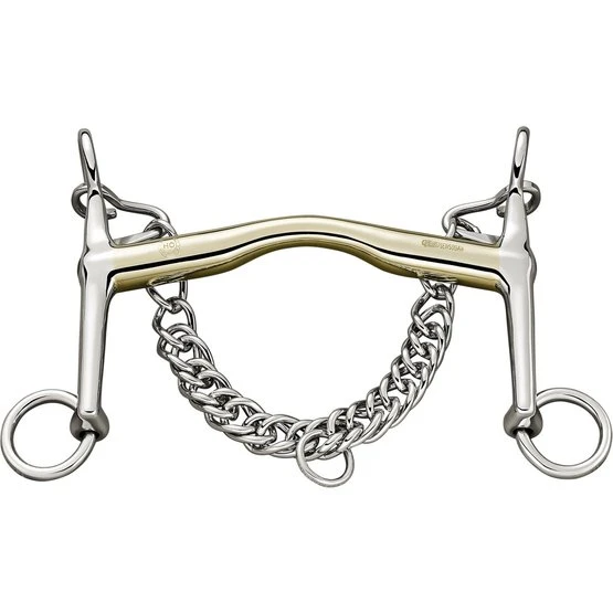 Dressurstange HO. 14 mm dick. 11,5 cm breit. Material Sensogan mit Edelstahlschere. Dieses einzigartige Mundstück ist leicht nach vorne geneigt und abgerundet, um den Druck gleichmäßig auf die Zunge zu verteilen. Die HO-Leiste arbeitet optimal auf der Zunge für die ultimative Verfeinerung der Zügelhilfen. Sehr gut geeignet für den Übergang zur Stabtrense. Schere 5 cm. Hat durch die kurze Schere eine leichte, aber direkte Wirkung hinter den Ohren.